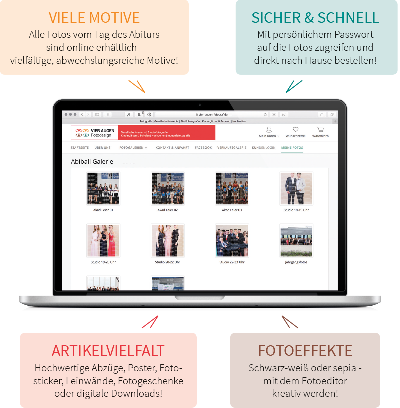 Bestellen könnt ihr eure Fotos über die passgeschützte Onlinegalerie. Den Link zur Galerie und das Kennwort erhaltet ihr auf eurer Veranstaltung.